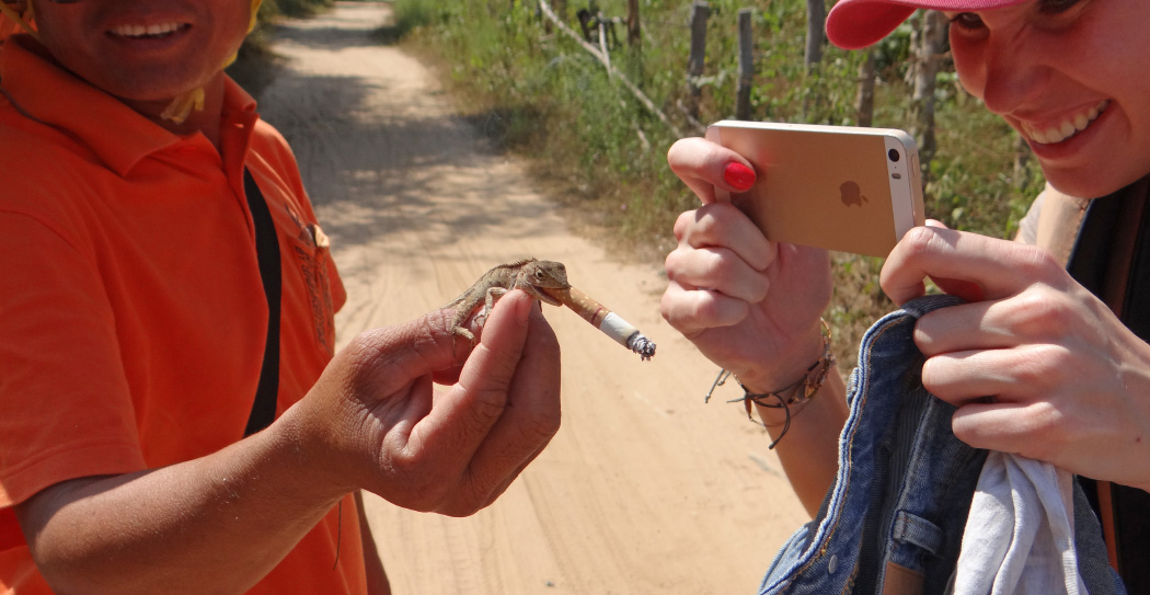 A na jednej z tzw. Czterech tysięcy wysp w Laosie przewodnik przekonuje, że jaszczurki też lubią palić papierosy, łapiąc jedną z nich i wtykając jej szluga w pysk. Przymyka oczy. Zaciąga się?
