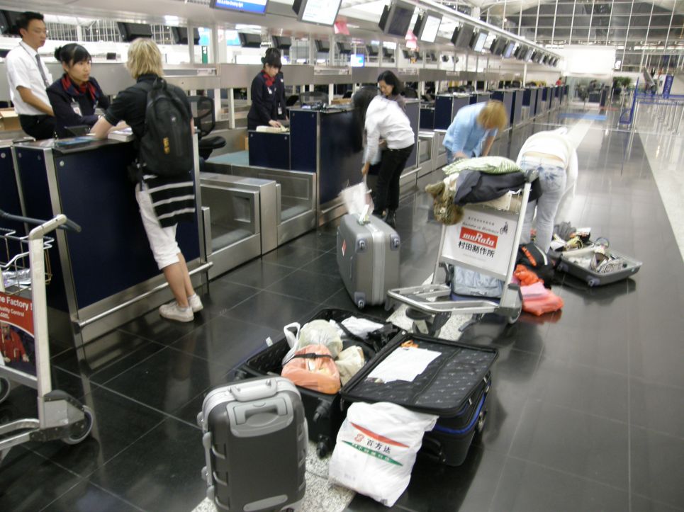 Przepakowywanie bagaży na lotnisku w Hong Kongu tuż przed odlotem samolotu było dla mnie i moich znajomych dobrą lekcją. Z tej formy edukacji mniej byli zadowoleni pracownicy lotniska (spójrz na minę tej pani). Żeby było ciekawiej - dla zmniejszenia wagi bagażu postanowiłem opróżnić heroicznie piwo, które... eksplodowało pianą tuż przed pracownikami linii. Wtedy powiedzieli, żebyśmy już sobie poszli.