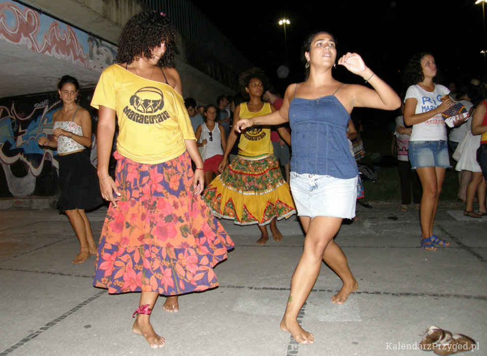 Jechałem sobie autobusem i obok ładnego skądinąd parku Flamengo usłyszałem muzykę. Wysiadłem i po dźwiękach doszedłem do grupy kilkudziesięciu osób. Jedni grali na bębnach inni tańczyli. Niesamowita energia udzielała się przechodniom spontanicznie dołączającym do muzyków. Skorzystałem również z zaproszenia na bezpłatną lekcję gry maracatu (widowisko łączące grę na bębnach i taniec). Takich grup grających tego rodzaju sambę jest oczywiście pełno w Brazylii. Na co dzień ćwiczą w zamknięciu, ale czasem wychodzą sobie pograć na miasto. Gratis. Dla zabawy.